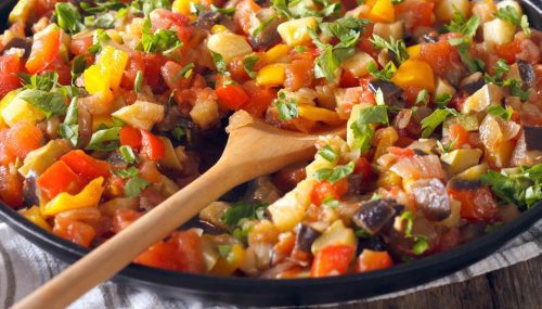 Ingredienti per 2 persone: 4 zucchine, 2 peperoni, 2 melanzane, 4 carciofi, 1 cipolla piccola, 4 patate piccole, 2 pomodori ramati, 2 carote, 100 g fagiolini, prezzemolo, basilico, ½ spicchio di aglio, ½ dado, 2 cucchiaini di olio extravergine d’oliva.