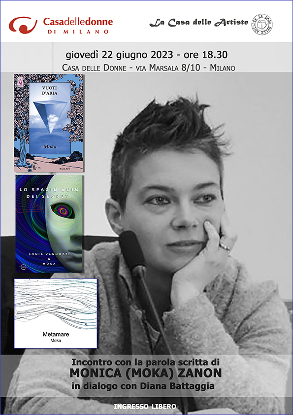 Per 20 anni ha lavorato nel campo aeronautico e in parallelo ha arricchito la sua esperienza in quello editoriale e nell’organizzazione di eventi. Attraverso l’Associazione Licenza Poetica, di cui è presidente e co-fondatrice, ha ideato, organizzato e promosso diversi progetti, oltre alle sette Edizioni del Concorso Poetico, Letterario e Fotografico, di cui ha curato anche le antologie. Da qualche anno collabora con Claudio Ardigò nella scelta degli autori da proporre alla Fiera del Libro di Cremona. Collabora con Il Babi Editore, dal 2020 è curatrice della neo collana digitale di poesia “I Girini“. Nel 2022 ha incrementato l’impegno entrando a far parte della redazione. Ha diverse pubblicazioni all’attivo, sia poetiche sia di narrativa, che potete trovare sul suo sito www.mokaend.com, giovedì 22 giugno ore 18.30, sarò ospite dell’Associazione La casa delle Artiste presso La Casa delle Donne a Milano per parlare delle sua scrittura e delle ultime tre pubblicazioni: Vuoti d’aria (poesia), Metamare (romanzo epistolare) e Lo spazio buio dei segreti (romanzo fantascientifico), scritto a quattro mani con Sonia Vannozzi.