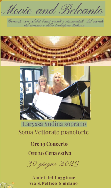 Sonia eseguirà colonne sonore spaziando in generi e stili molto diversi, dal classico al pop allo swing. Quindi diversi echi da musical e cafè chantant atterrando nelle melodie divine di Rota, Morricone, Piovani, i grandi compositori italiani per il cinema. E Laryssa? Già apprezzata nel giardino del don Lisander, in via Manzoni, la leggiadra biondissima soprano, (la