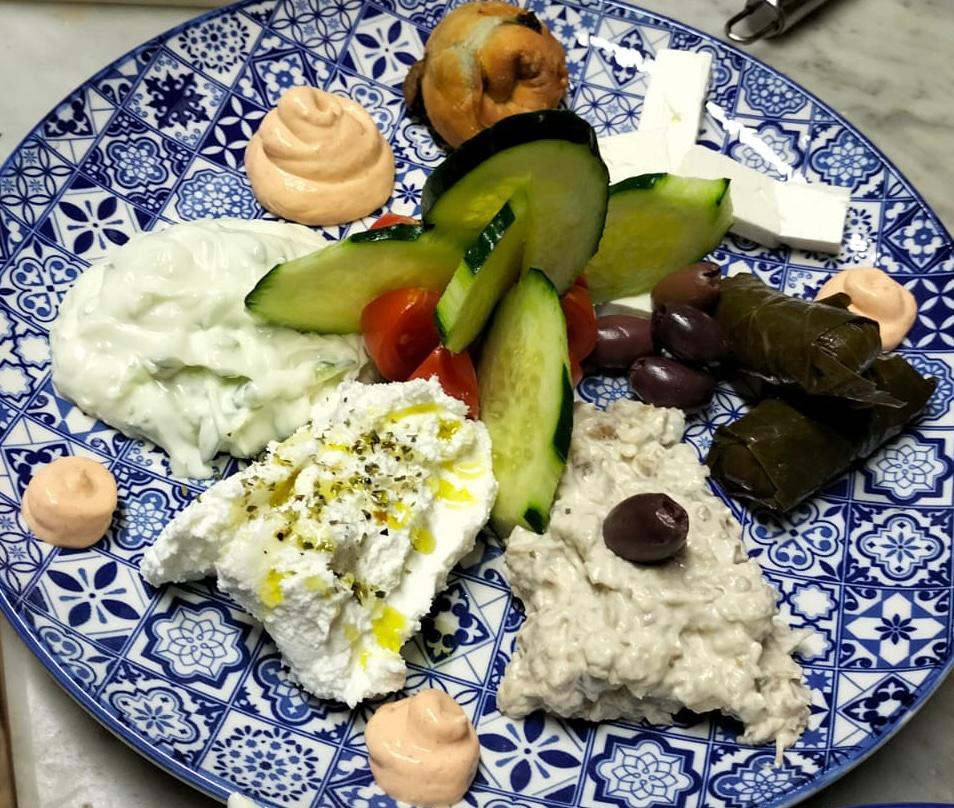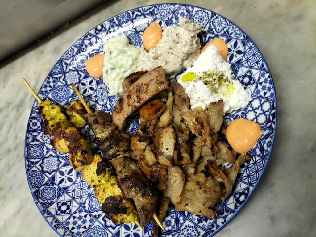 La pita greca che arriva sulla tavola è appena sfornata e super sottile subito affiancata da tre scodelline contenenti hummus (purea di ceci), tzatziki – con cetrioli noci e yogurt – e melemzanosalata– pasta di melanzane -, non manca l’olio evo greco e per chi vuole, a piacere una nuvola di polvere di chili.