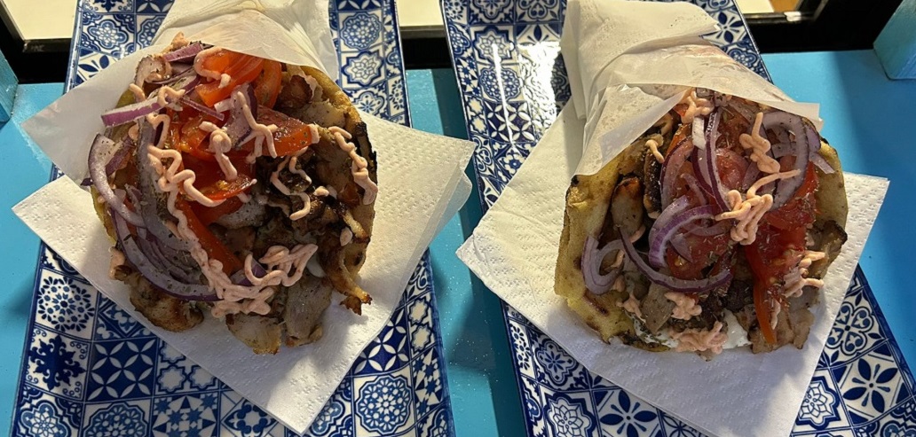 Nell’altro tavolo ordinano un MEGA PITA GYROS D’AGNELLO, ovvero una mega pita ripiena di carne d’agnello, cipolla di tropea, salsa tzatziki, pomodoro fresco, origano, salsa piccante e patatine fritte!