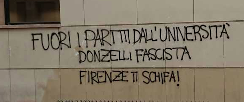Nel novembre 2019 a Firenze i collettivi studenteschi avevano manifestato senza permesso al polo delle scienze sociali di Novoli. Questo perché a tenere il discorso universitario sulle “Theories and practices of lobbying” era stato invitato il deputato di Fratelli d’Italia Giovanni Donzelli. Alcuni di questi studenti appartenenti ai collettivi universitari lo accolsero con striscioni offensivi che ne contestarono la presenza e furono tenuti a distanza dalle forze dell’ordine in tenuta antisommossa. Proprio in quell’occasione furono pronunciati insulti nei confronti degli agenti, accusandoli addirittura di “difendere i fascisti e gli stupratori”.