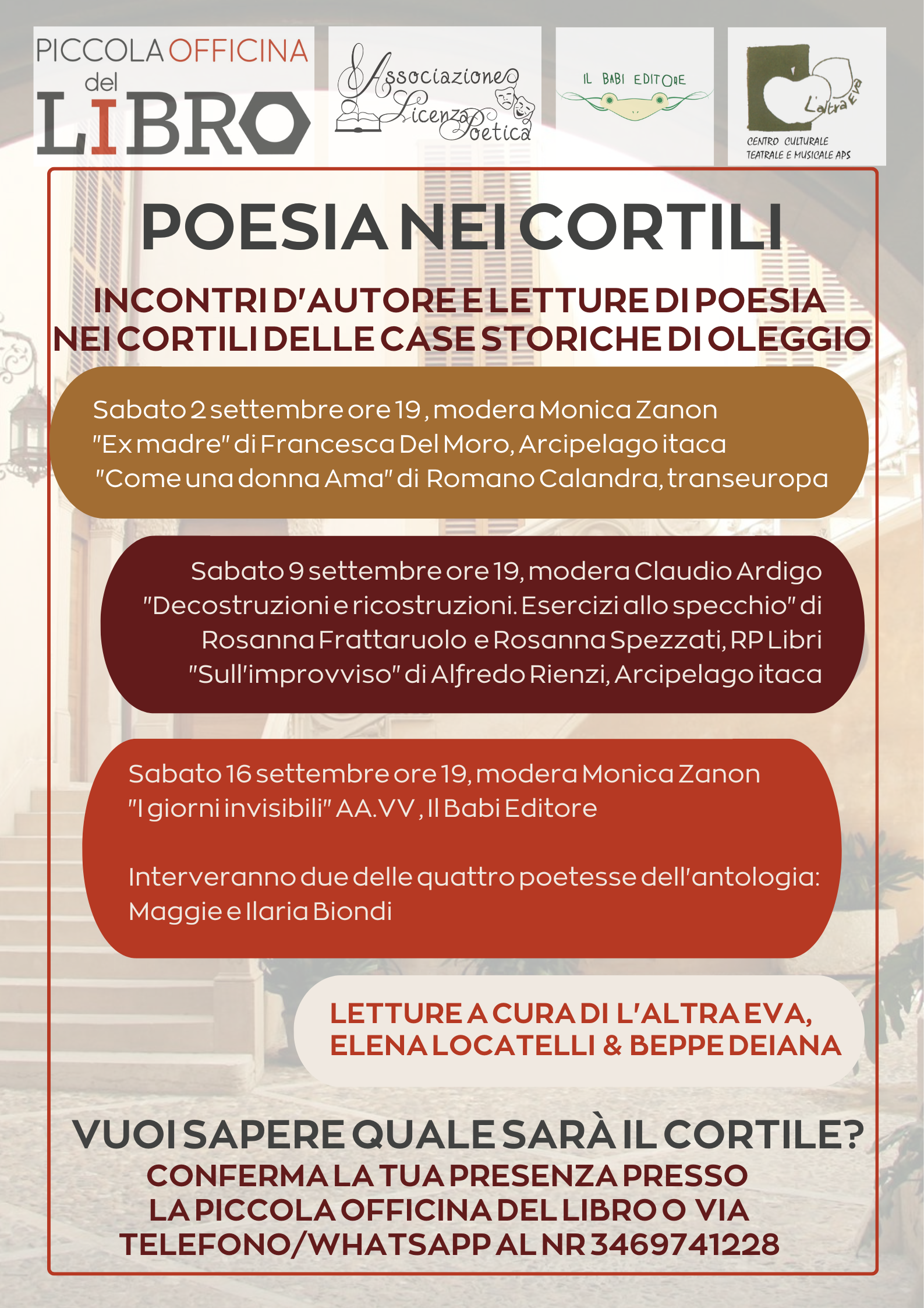 È obbligatoria la prenotazione presso la Libreria Piccola Officina del Libro oppure via telefono/whatsapp al numero 346/9741228, poiché solo prenotando si potrà scoprire il cortile che ospiterà l’incontro.