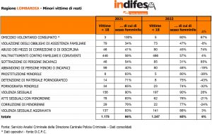 Ennesimo record di reati a danno di minori in Italia nel 2022: sono stati 6.857, con un drastico aumento del 10% dal 2021, quando il dato aveva superato per la prima volta quota 6mila. In Lombardia, dove l’incremento è stato del 6% (da 1.175 a 1.247 casi) e il numero di vittime minori è il più alto tra le Regioni, spicca il dato di 5 omicidi volontari consumati, il più alto in Italia e pari a un aumento del 67% in un anno (erano 3 nel 2021). Oltre alla Lombardia, ne hanno registrati Sicilia (3 casi), Campania, Friuli Venezia Giulia e Piemonte (rispettivamente 1). Deciso l’aumento di violenza sessuale (+26% da 156 a 197 casi) e violenza sessuale aggravata (+3% da 137 a 141 casi), le due tipologie di reato più frequenti dopo i maltrattamenti contro familiari e conviventi (da 446 a 466, +4%). I dati, elaborati dal Servizio Analisi Criminale della Direzione Centrale Polizia Criminale, sono stati resi noti dalla Fondazione Terre des Hommes nel Dossier indifesa “La condizione delle bambine e delle ragazze nel mondo” 2023, in occasione della Giornata mondiale delle bambine (11 ottobre). Il documento è stato presentato a Roma, al MAXXI Museo delle Arti del XXI Secolo, alla presenza di Stefano Delfini, direttore del Servizio Analisi Criminale della Direzione Centrale della Polizia Criminale del Dipartimento della Pubblica Sicurezza; Carla Garlatti, Autorità garante per l’infanzia e l’adolescenza; Oleksandra Romantsova, direttrice esecutiva del Centro per le libertà civili di Kiev, premio Nobel per la pace 2022; Donatella Vergari, presidente di Terre des Hommes Italia.