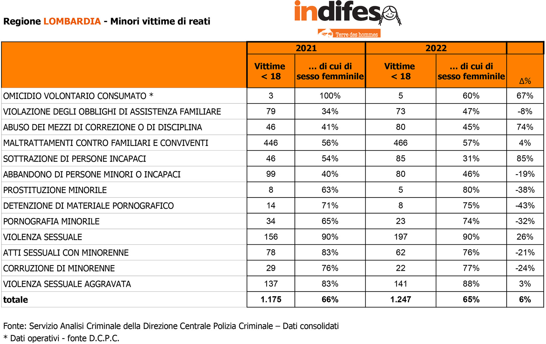 Nei confronti di minori, aumentano su base annuale i reati di violazione degli obblighi di assistenza familiare (551 casi nel 2022, +10% dal 2021), abuso dei mezzi di correzione o disciplina (345 casi, +17%), maltrattamenti contro familiari e conviventi (2.691 casi, +8%), sottrazione di persone incapaci (290 casi, +8%), abbandono di persone minori o incapaci (550 casi, +13%), detenzione di materiale pornografico (72 casi, +9%), atti sessuali con minorenne (430 casi, +4%), violenza sessuale aggravata (697 casi, +13%). Calano, invece, alcune fattispecie di reato. L’omicidio volontario consumato in un anno diminuisce del 37% (da 19 casi del 2021 a 12 casi del 2022), e sul confronto su base decennale si registra un -33%. In discesa anche la prostituzione minorile con -14% (da 43 a 37 casi), mentre il dato è sceso del 52% dal 2012. La pornografia minorile è diminuita del 10% (da 187 a 169), ma dal 2012 al 2022 è aumentata del 56%. Un calo si registra anche per la corruzione di minore, -21% in un anno (da 136 a 107 casi) e -20% dal 2012 nonostante si tratti di un reato legato alla sfera dei reati a sfondo sessuale, che, come visto, sono in crescita. «I dati relativi al 2022 sono elevati, e alla preoccupazione per la crescita tendenziale degli indicatori, abbastanza costante negli ultimi anni, va aggiunto l’allarme per le possibili e gravi conseguenze che derivano da tale forma di violenza; le giovanissime vittime rischiano di diventare adulti che porteranno per sempre nella loro anima orribili e, spesso, invisibili cicatrici.», ha dichiarato nel rapporto di Terre des Hommes Stefano Delfini, direttore del Servizio Analisi Criminale della Direzione Centrale della Polizia Criminale del Dipartimento della Pubblica Sicurezza. «Per affrontare questo fenomeno è necessario un esame accurato e un approccio complessivo, che prendano le mosse da un’effettiva conoscenza del fenomeno, nelle sue dimensioni e nelle sue tendenze evolutive. In particolare, è fondamentale riservare la massima attenzione alle violenze e agli abusi sui minori online non solo nella prevenzione e nel contrasto, ma anche nell’attività di supporto alle vittime e nella predisposizione di campagne informative mirate a rimuovere quegli ostacoli socioculturali per debellare il fenomeno nel prossimo futuro.», ha aggiunto.