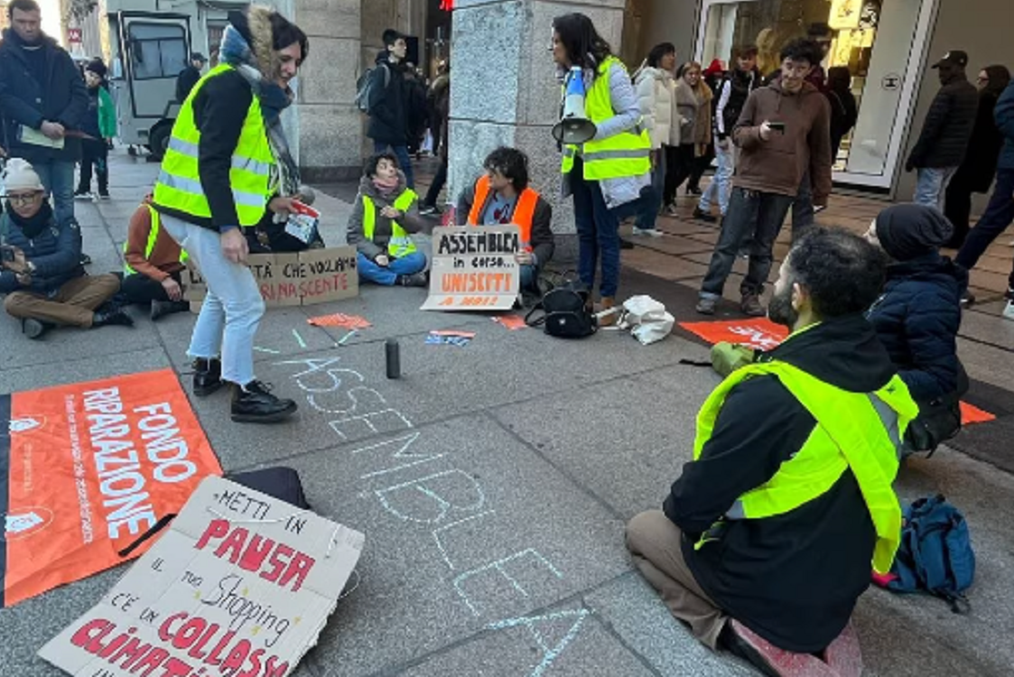 Blitz di Ultima Generazione di fronte alla Rinascente a Milano in Piazza Duomo. 9 attivisti del clima hanno attuato un sit-in davanti aprendo due striscioni con scritto “Fondo Riparazione”.