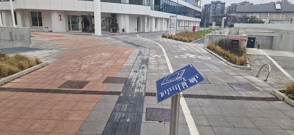 Appena oltrepassato il cancello della struttura, la corsia pedonale per raggiungere l’ufficio si presentava dapprima stretta e poi bloccata da transenne di lavoro.