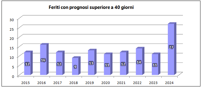 Infine, le proiezioni dei dati sui feriti lievi, hanno fatto registrare lo stesso dato dello scorso anno ovvero 10 casi con prognosi inferiore o uguale ai quaranta giorni, per ferita d’arma da fuoco, mentre dai 159 casi con prognosi inferiore o uguale ai quaranta giorni, dovuti ai fuochi d’artificio, si è passati agli attuali 232 casi.
