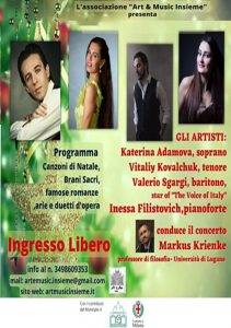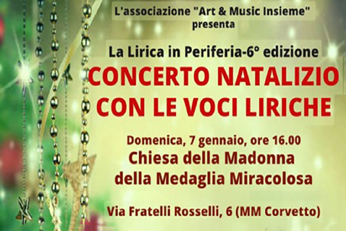 Reduce dai recenti successi di pubblico degli spettacoli tenuti a Villa Mirabello, alla Fondazione Ambrosianeum e a Casa Verdi, l’Associazione Art & Music Insieme, affermata realtà nel panorama culturale milanese e punto di riferimento per gli appassionati di musica classica e bel canto, nell’ambito della sesta edizione della rassegna musicale “La Lirica in Periferia”, domenica 7 Gennaio alle ore 16:00, presso la Chiesa della Medaglia Miracolosa in via F. Rosselli, n° 6 a Milano, organizza un pomeriggio di grande cultura, con musica lirica, brani e duetti d’opera e operetta e musica natalizia. Nel corso dello spettacolo si esibiranno il soprano Ekaterina Adamova, il tenore Vitaliy Kovalchuk e il baritono Valerio Sgargi accompagnati al pianoforte da Inessa Filostovich. Condurrà il concerto il Prof. Markus Krienke.