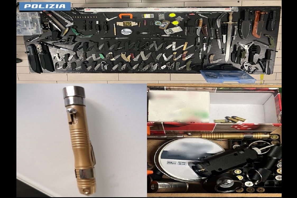In via Bacchiglione all’interno della sua abitazione, i poliziotti, con l’ausilio delle unità cinofile, hanno sequestrato circa 2 etti di hashish e una dose di marjuana, nonché un coltello utilizzato presumibilmente per tagliare la sostanza e due bilancini di precisione, quattro cilindri metallici completi di meccanismo di scatto ritenuti idonei per la fabbricazione di armi, una pistola a gas, un castello di pistola con canna otturata nonché numerose munizioni, un coltello di 21 cm nascosto tra le pieghe del divano, numerosi coltelli tattici, all’interno dell’armadio nello studio una penna pistola calibro 22 lunga 15 centimetri.