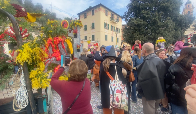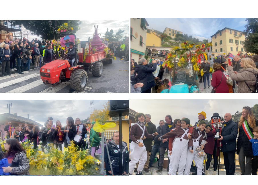 Decine di bambini , dalle elementari alle medie, e alla guida i loro insegnanti. Poi tutti al lavoro durante l’inverno con colla, martelli, fil di ferro, cartapesta: con pescatori, agricoltori, artigiani, ingegneri, medici, pensionati. Tutti preparano in box, cantine, retrobottega e magazzini i carri fioriti all’insegna della mimosa … Perché il fiore effimero della mimosa (come cantava Montale) è l’emblema di questo piccolo borgo in cima a una collina, tra Nervi e Santa Margherita, regno delle seconde case dei milanesi e con il più alto reddito pro capite di residenti in Liguria.