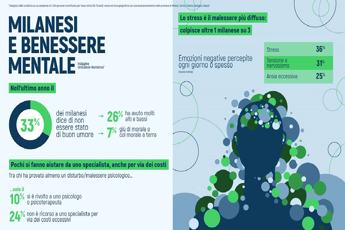 L’ultima ricerca dell’Osservatorio Sanità di UniSalute e Nomisma riguarda la salute mentale, con un focus anche sulla città di Milano. Nell’ultimo anno, un milanese su tre dice di aver avuto molti sbalzi di umore o di essere stato giù di morale la maggior parte del tempo. Il 36% si sente frequentemente stressato, il 31% teso e nervoso, il 25% soffre l’ansia. Solo il 10% però, tra chi lamenta almeno un malessere psicologico frequente, si è rivolto a uno psicologo, nonostante due milanesi su tre si dicano pronti a farlo in caso di necessità. Come mai? Per uno su quattro (24%) il motivo sono i costi delle sedute, considerati eccessivi per le proprie possibilità. Di seguito il comunicato con tutti gli altri dati.
