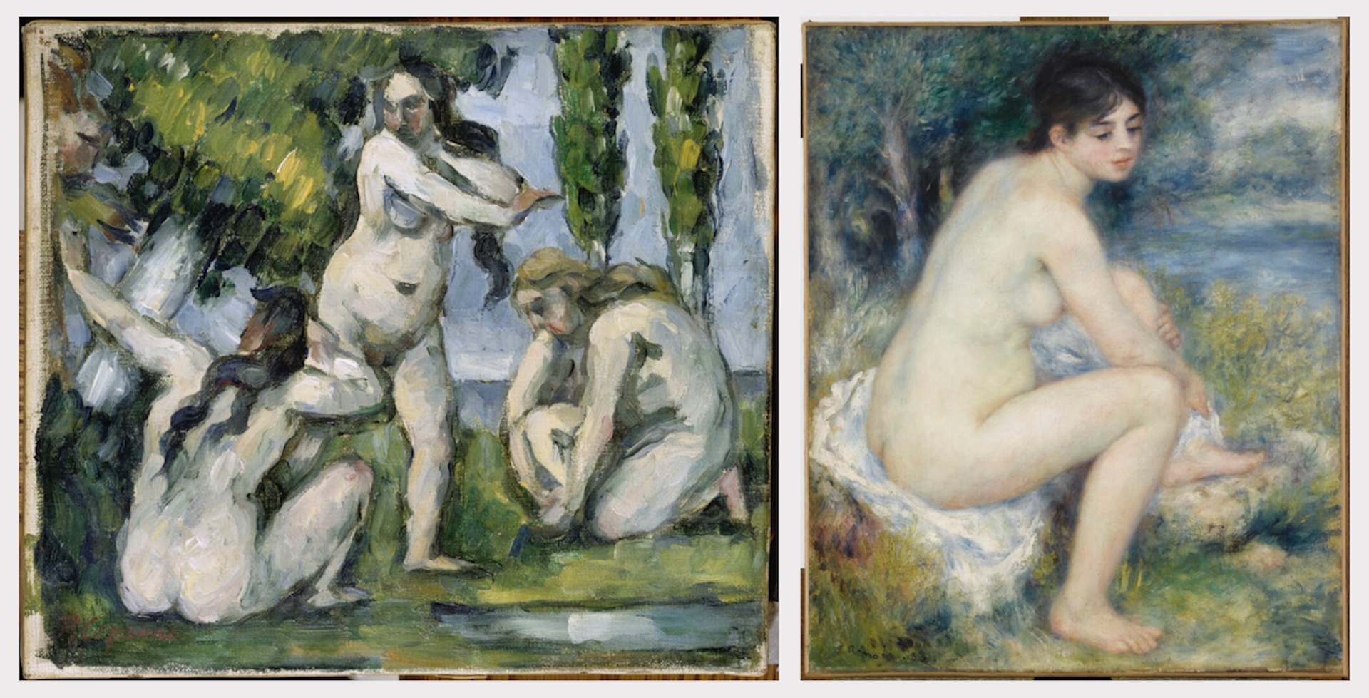 Questo dialogo tra l’opera di Cézanne e quella di Renoir costituisce la naturale estensione dello scambio intrapreso dai due nell’atelier di Charles Gleyre all’inizio delle rispettive carriere. Le loro affinità elettive si manifestano già negli anni Settanta, al Café de la Nouvelle Athènes a Parigi e in occasione delle prime mostre impressioniste cui partecipano insieme. Nonostante il progressivo allontanamento di Cézanne dalla scena parigina, i due amici continuano a frequentarsi e, nell’ultimo ventennio dell’Ottocento, Renoir sarà più volte ospite del maestro di Aix-en-Provence.