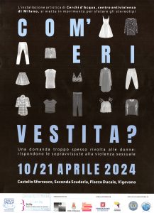 “Com’eri vestita? – Rispondono le sopravvissute alla violenza sessuale” è un’installazione, creata da Cerchi d’Acqua, in cui i vestiti esposti rappresentano simbolicamente quelli indossati durante la violenza subita e sono accompagnati da brevi suggestioni che le donne hanno voluto condividere, raccontando alcuni elementi della loro esperienza.