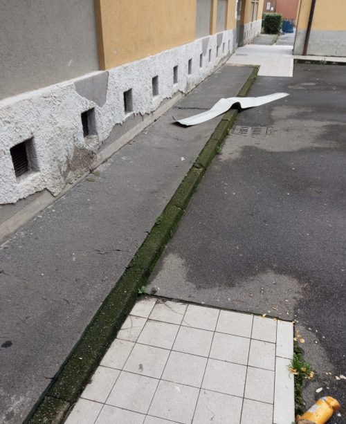 Nonostante il ripristino dell’antenna e del comignolo per ragioni di sicurezza, il tetto rimane attualmente in condizioni precarie. Le segnalazioni degli inquilini indicano la presenza di grandi tegole staccate, cadute nel cortile, e infiltrazioni d’acqua all’interno degli appartamenti, una situazione che si protrae da mesi. Inoltre, si lamentano rumori continui dovuti al movimento delle tegole causato dal vento.