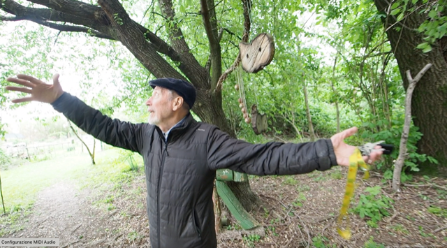 Oggi risiede in un condominio che si affaccia sui boschi che separano il borgo di Chiaravalle dalla tangenziale e dalla linea ferroviaria. All’orizzonte, oltre i pioppi, si intravedono i palazzi di acciaio e vetro di san Donato Milanese. Il luogo di Chiaravalle, ricco di fonti e di laghetti, è meta delle cicogne che qui nidificano. Entriamo per la prima volta con una video camera in un giardino incantato, destinato alla meditazione, ma ancora sconosciuto ai milanesi, alle scolaresche, agli insegnanti, agli scrittori e alla cultura… Un lungo verde percorso, quasi alchemico, tra i canneti, olmi e pioppi porta il visitatore solitario indietro nel tempo, alla cultura greca e al motto : conosci te stesso.