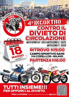 Si definiscono bikers, sono stati chiamati  alla “ leva” dal motociclista – eroe  Lorenzo Gioacchini che ha fondato il movimento trasversale e apolitico  “Divieto”: i bikers (non più solo milanesi  perché il movimento si  esteso a tutta Italia, vedi cartina)  protestano da mesi  contro un odioso provvedimento discriminatorio verso le due ruote. Una ingiusta delibera europea prescrive il divieto di entrare da ottobre nelle mura di ogni città con un motociclo euro 0 e euro 1, per il momento, in città superiori a 30.000 abitanti. Ma il divieto colpirà progressivamente tutti i motociclisti: nel 2025 toccherà ai motocicli euro 2, e  via via, nel 2028  con gli euro 3. E città  italiane si  stanno adeguando. Follia green.