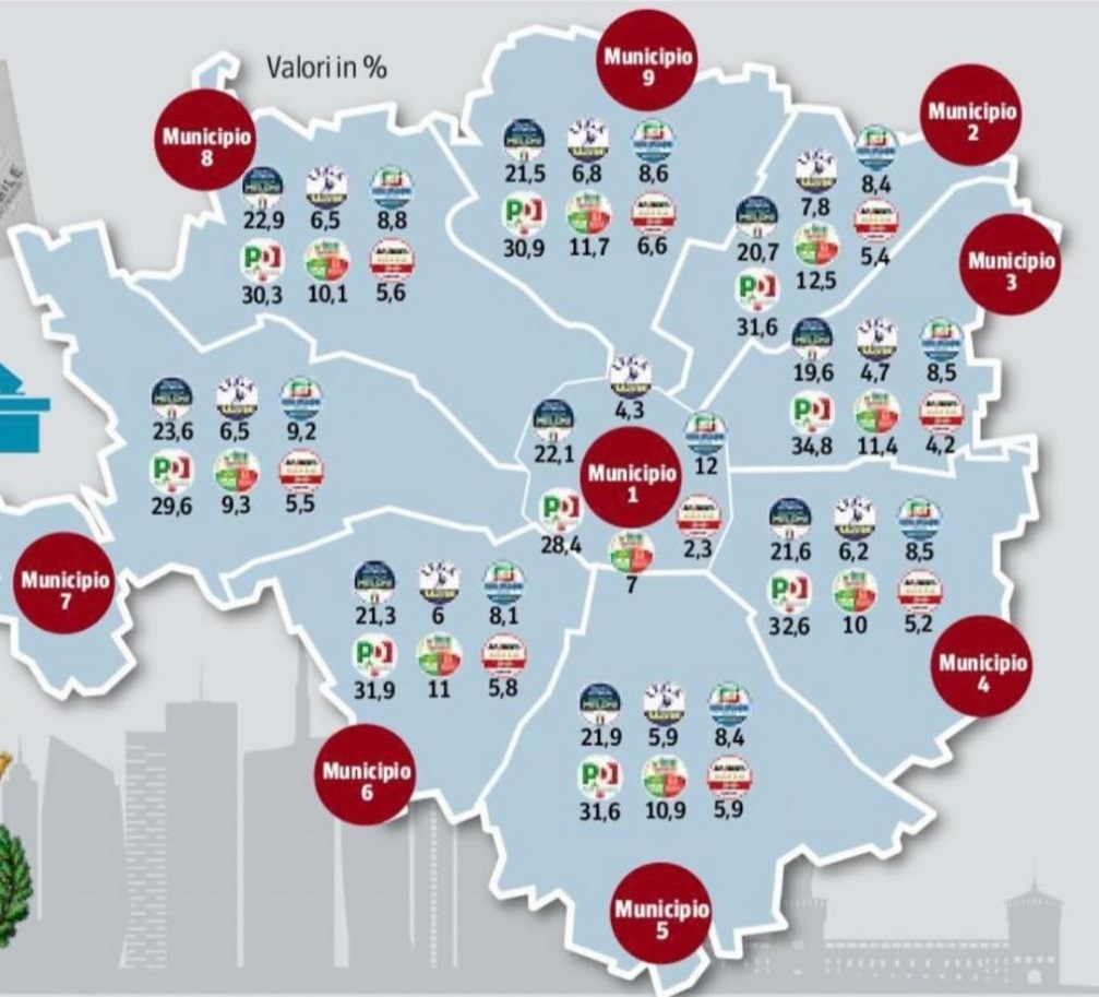 Situazione simile per il Partito Democratico. La media nazionale è al 24,08%, che nei 133 comuni della Città metropolitana (compresa Milano città) sale al 27,19%, mentre a Milano il consenso schizza al 31,38%.