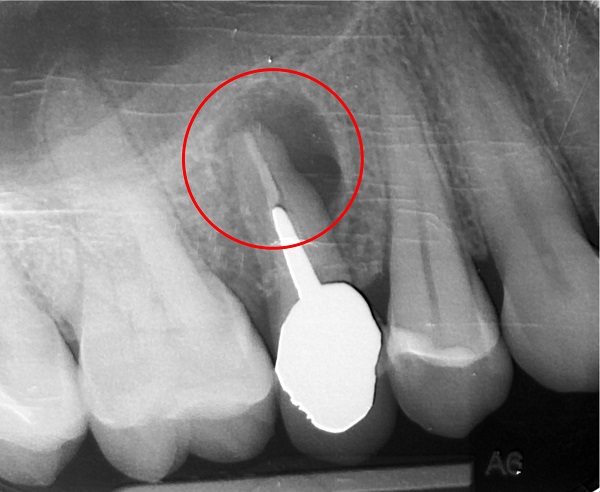 Infatti è una reazione infiammatoria di tipo cronico (cioè che dura da molto tempo) costituita da un ammasso di cellule addette alla difesa dell’organismo che si dispongono a cerchio attorno all’apice del dente, quasi a costituire un tappo, un argine alla grande quantità di batteri che proviene dal canale del dente non ben devitalizzato oppure dal “nervo” morto e non asportato (polpa dentale necrotica).