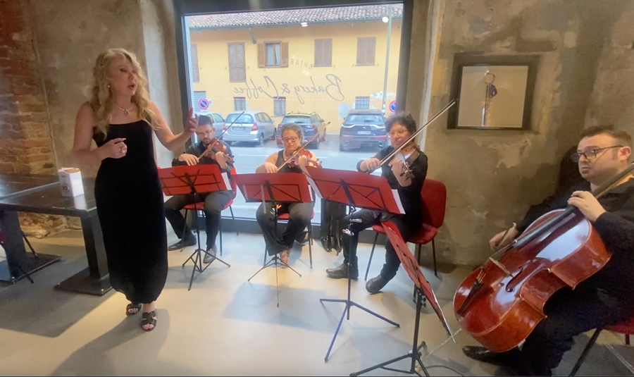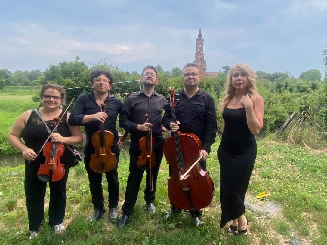 Pioviggina….Ci troviamo a un insolito concerto d’archi nell’antico borgo di Chiaravalle, alle spalle del celebre campanile, detto la Ciribiciaccola: ma cosa succede in questa estate che alterna afa e temporali improvvisi ? Ore 19  di un venerdì di mezza estate…. Arriva  tra i verdissimi prati  la star della serata, il famoso soprano Larissa Yudina, stella della musica lirica internazionale…. Il pigro ma magico borgo di Chiaravalle, sorto tra marcite, stalle, cascine (qui  nacque il grana padano)  è un gioiello di  storia , di inviti alla meditazione. al silenzio. Anche in  questo   insolito fine settimana  di luglio, afoso e nervoso, si avverte nell’aria qualcosa di singolare. L’armonia della  abazia fondata da San Bernardo si irradia tra le stradine, che altrove potrebbero essere simili ai consueti dormitori di periferia.   Ma qui tutto è speciale e il Municipio 5 ha  osato,  proponendo tre venerdì di musica classica. Una  orchestra d’archi in formato mignon , che Gianfranco Messina dirige con piglio, accoglie i residenti  in questo secondo  venerdì  ( dalle ore 19):  sono orari insoliti,  densi di faccende domestiche, di risposo, di partenze al mare, di  spesa grossa  nei supermercati …Ma è imperdibile questo  concerto di archi nei prati.  E’ stata una sfida ..Ha appena finito di piovere, e dal vicino  fazzoletto di verde che costeggia  una roggia l’orchestrina si trasferisce nell’accogliente bakery della piazzetta del borgo, e sotto i suoi tendoni riprende  il concerto,,,