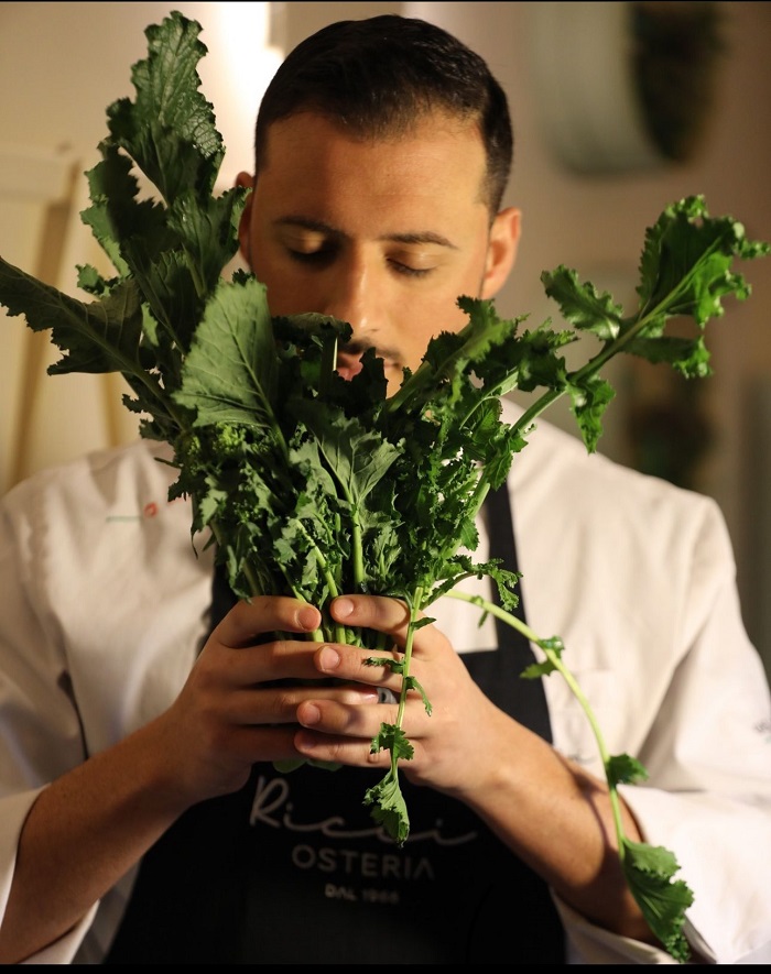 Affidare la cucina di Ricci Osteria a Francesco Bordone è stato come azzeccare un Bingo. Francesco è decisamente il “cuoco del futuro”, come lo definisce Massimiliano Paradisi. Figlio di panificatori si è sporcato di farina fin da bambino, ha studiato con impegno all’alberghiero ed è partito per la gavetta all’estero, con le idee molto chiare sul lavoro che voleva fare nella vita. Ha lavorato a testa bassa in cucine stellate e faticose, senza mollare, ma oggi sa che la cucina che fa per lui è quella vera, concreta, con una storia e una tradizione, quella dei ricordi ma proiettata nel presente, insomma la cucina come la intendono anche Vinod e Antonella.