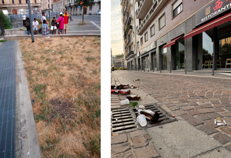 La situazione che poi si trova dopo quasi ogni sera/”notte” (soprattutto durante i weekend) lascia a dir poco allibiti, numerosissime bottiglie di birra, avanzi di cibo ed ogni tipo di spazzatura sparsa all’interno delle aree utilizzate abusivamente, “l’AMSA interviene rarissimamente ma solo su sollecitazione dei residenti” (la pulizia sarebbe a carico dell’amministrazione box e non di competenza AMSA) con costi a carico dei contribuenti ed impedisce ai proprietari di cani di poter portare il loro amico a quattro zampe a passeggiare all’interno di questi spazi per la presenza di cocci e pezzi di vetro taglienti – Sono soprattutto le portinerie dei civici coinvolti che si fanno carico della pulizia degli spazi e dei giardinetti antistanti, anche se non di loro competenza, dedicando ore di lavoro a discapito della pulizia degli stabili.