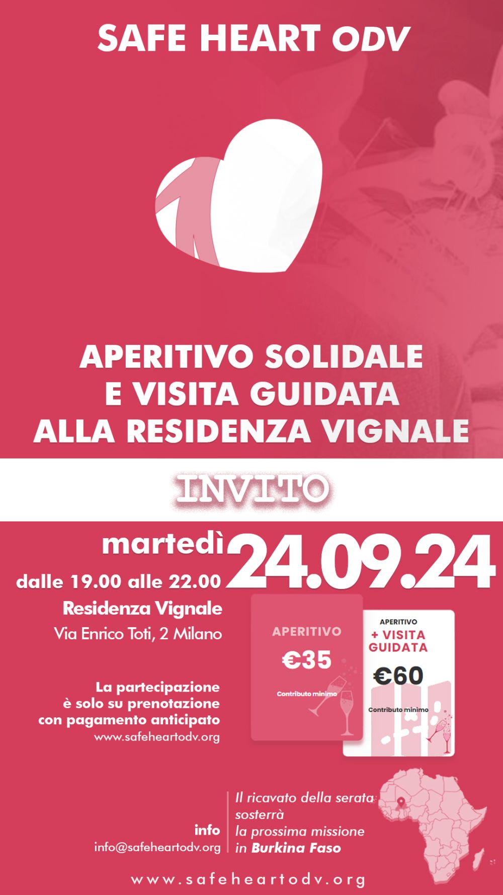 Safe Heart ODV, associazione di solidarietà sociale per la diagnosi e la cura delle patologie cardiovascolari verso tutte quelle popolazioni ferite da guerra e povertà, organizza per il 24 settembre UN APERITIVO SOLIDALE ED UNA VISITA GUIDATA alla Residenza Vignale di Milano (via Enrico Toti, 2). Il ricavato della serata sosterrà la prossima missione di Safe Heart ODV in Burkina Faso.