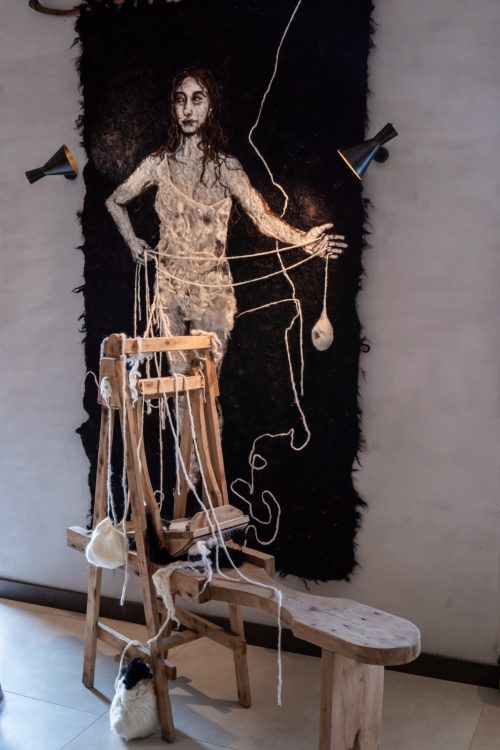 La riproduzione vede una cardatrice da cui partono un insieme di fili di lana che vanno a comporre l’immagine di Aracne. Alcuni bozzoli sapientemente lavorati e disposti all’ingresso dell’Hotel, accoglieranno gli ospiti, anticipando la coinvolgente atmosfera che si vivrà all’ interno.