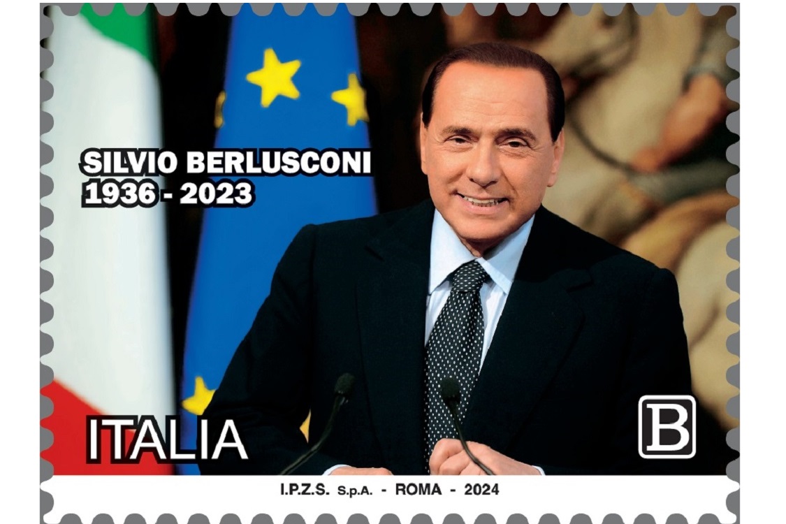 Completano il francobollo la legenda “SILVIO BERLUSCONI” e le date “1936 – 2023” la scritta “ITALIA” e l’indicazione tariffaria “B”.