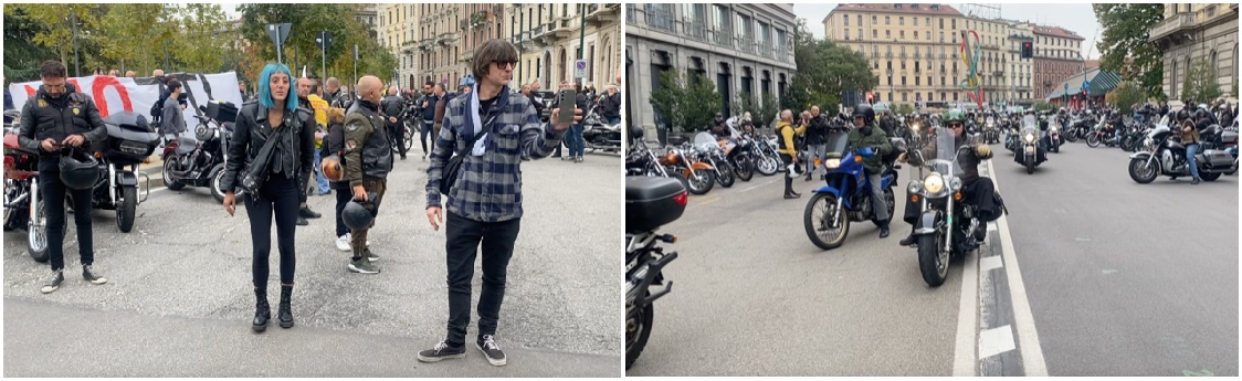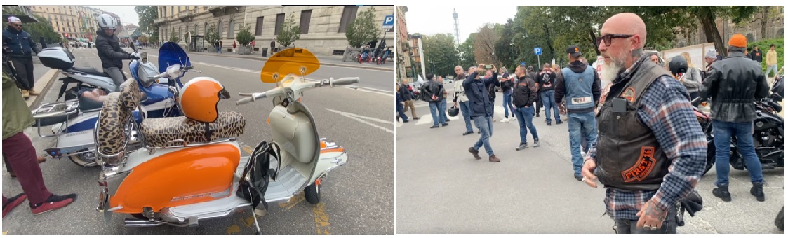 Arrivano al Castello Sforzesco in seicento, preannunciati dal solito rombo simile a un trattore delle luccicanti Harley- Davidson (si sa che il mito Harley in Italia è nato a Milano in via Nicolini, oggi China Town) e preceduti da una staffetta di lambrettisti d’epoca ecco gli Hells Angels e gli Owner del club dedicato, tutti con il tipico chiodo e il fare da ceffo californiano, con le insegne del clan motociclistico d’appartenenza sul retro del giubbotto di pelle. Chi viene da Brescia, chi da Vigevano, chi da Lodi… e poi, dietro, i motoclub cittadini, i biemwuisti, i guzzisti, i morinisti, i ducatisti, i vespisti, gli aprilisti, e chi conserva la propria cavalcatura da decenni nel box, sia un Ciao che un Galletto Guzzi. Tutti proprietari di moto che dal prossimo anno non potranno più circolare.