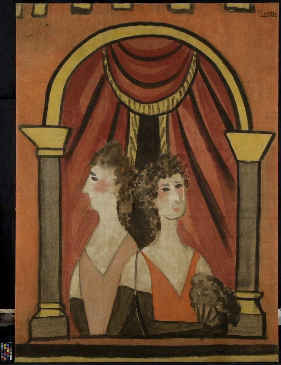 Con un abile gioco d’immagine dentro l’immagine, l’artista sceglie come soggetto il luogo scenico stesso: dipinge in rosso, nero e oro e a trompe-l’œil la sala di un teatro in stile Napoleone III, con soffitto a volta modanata e affrescata, due ordini di palchi e spettatori seduti. L’interno appare descritto nei dettagli architettonici di modanature, colonne, stucchi in gesso dorato e ovale centrale raffigurante un suonatore di tromba; il dettaglio di un primo studio di questo personaggio è riprodotto in uno dei disegni parigini, accompagnato da schizzi architettonici. Una cortina rossa, geometricamente ripiegata, segna la separazione fra lo spazio del pubblico e il boccascena, che si apre su un interno prospetticamente descritto e contemporaneamente ribaltato e negato: gli angoli della stanza, piuttosto che l’idea di profondità, sembrano spingere la parete di fondo in avanti e portano in primo piano l’oggetto centrale della scena, un quadro con una stilizzata natura morta di fiori. Picasso immagina di popolare il finto teatro con spettatori accomodati all’interno di palchetti al lato del proscenio: i due balconcini di sinistra ospitano coppie in abiti eleganti, quello di destra due figure femminili. Della loggetta in basso a sinistra conosciamo due disegni a matita su carta, pure conservati. Per ragioni economiche, Djagilev stesso nel 1926 fa tagliare, per isolare e rivendere i dettagli figurativi più significativi e in cui figura la firma di Picasso: “Ven- derò […] quelle parti dello scenario di Cuadro Flamenco con incluse delle figure, poiché sono tutte firmate. Ho già trovato un acquirente in Germania, e con quel denaro potrò allestire nuovi spettacoli”. Il dipinto “La loge (Le balcon)”, per anni conservato – e quasi dimenticato – nei depositi della Pinacoteca di Brera, è esattamente uno di quei frammenti risparmiati e venduti.