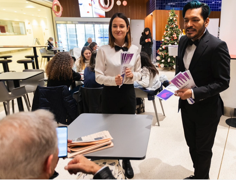 Un ristorante con piatti pronti e veloci in via Ripamonti, periferia di Milano, accanto alla Fondazione Prada, tra scuole di moda e loft di designer, tra artisti, modelle, studenti, pensionati e operai dell’edilizia addetti alla costruzione di un villaggio olimpico: ed ecco una oasi culturale…in un angolo del supermercato Esselunga, tra i tavoli del bar ristorante, di fronte al padiglione dei fiori, ma a pochi metri dalle casse va in scena la degustazione poetica ..Due camerieri dell’anima, Paola e Matteo, vagano tra i tavoli porgendo un menu insolito…Chi, immerso nelle tagliatelle o nel risotto con funghi sceglie Ada Merini e chi Trilussa, Palazzeschi o Leopardi…