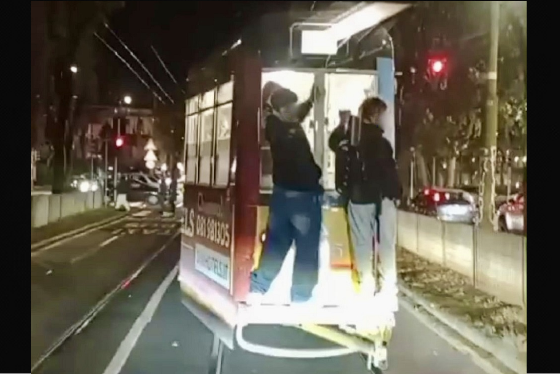 (In alto l’immagine dei due ragazzi appesi sul tram della linea 2 all’altezza della fermata Lancetti-Valtellina.)