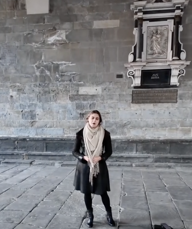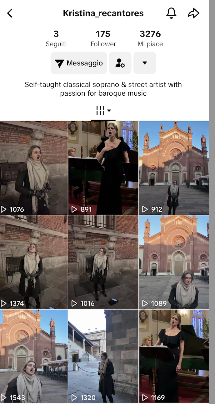 Ma ora, eccoci al debutto dell’opera lirica. Gorgheggia, e senza microfono, nelle strade del centro da alcuni giorni una misteriosa soprano russa, Kristina Bystrykh Recantores: bionda, angelica, a volte in abito da sera nero, avvolta in uno scialle ottocentesco che diremmo letterario ma con il cellulare in mano collegato a una piccola cassa acustica che trasmette la base operistica, la soprano improvvisa inaspettati pezzi d’opera e stupisce i passanti. Una visione tra Fellini e Buzzati: Kristina arriva dalle fredde lande moscovite (lei si definisce “self taught classical soprano with passion for baroque music.”) e appare e scompare improvvisamente con i suoi mini concerti, a Brera, o davanti alle chiese di corso Garibaldi fino al Castello, e infine davanti a palazzo Marino: ma per i suoi mini concerti Kristina predilige la chiesa del Carmine, sede dell’antica “Scuola dell’Abito del Carmelo” e della “Arciconfraternita dei Divoti della Purificazione” dove esegue le amate arie da Monteverdi.