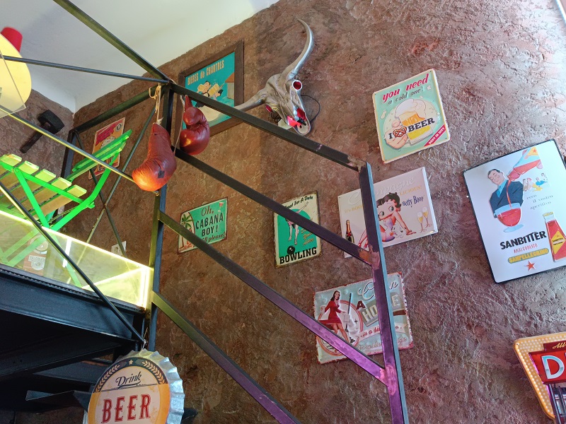 Due livelli ricavati con uno scenografico soppalco in ferro che si raggiunge salendo la scala tappezzata di quadri, opere e memorabilia che richiamano la Pop Art dei gloriosi ’70 e ’80, al piano terra un bancone in resina pregiata e un comodo salottino, tutto illuminato da giochi di luci led colorate e completato da un attrezzato dehor sull’ampio marciapiede.