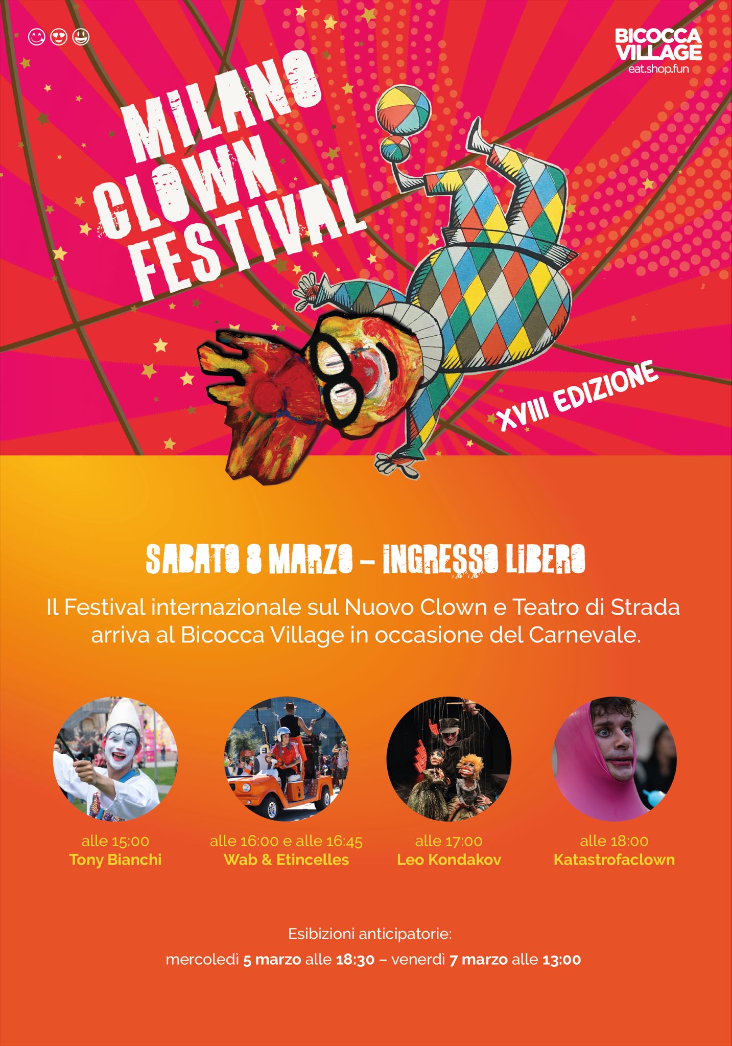 Bicocca Village e il Milano Clown Festival. In occasione della 18esima edizione del Festival internazionale dedicato al nuovo clown e al teatro di strada, sabato 8 marzo a partire dalle ore 15. Gli spazi del Bicocca Village si trasformeranno in un palcoscenico d’eccezione, accogliendo esibizioni spettacolari e performance mozzafiato in un ricco programma di eventi. La giornata clou del Sabato di Carnevale verrà anticipata da due assaggi. Mercoledì 5 marzo alle 18.30 e venerdì 7 marzo alle 13.00 gli artisti faranno visita al Bicocca Village accompagnati dal PIC-bus. Il bellissimo autobus con terrazzino sul tetto, per portare a tutti la gioia del festival.