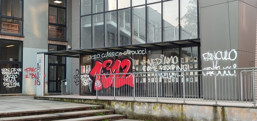Mercoledì notte ignoti sono entrati al liceo classico “Carducci” di Milano e lo hanno imbrattato con scritte e insulti di ogni genere rivolti al preside Andrea Di Mario e alle forze dell’ordine. A quanto si apprende il raid sarebbe partito dopo che il preside ha diffuso una circolare per un caso in cui “il nome del nostro istituto è stato utilizzato impropriamente. Infatti, gli studenti che come ogni anno hanno deciso di organizzare fra loro l’acquisto di felpe personalizzate, al di fuori della scuola, col nome del liceo associato a un loro disegno, hanno scelto, fra varie proposte, un’immagine contenente un messaggio aggressivo, ostile e discriminatorio, dal più senza nemmeno domandarsi se fosse lecito, o addirittura senza farci nemmeno caso”.