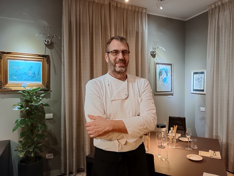 Ma tutta questa meraviglia, che ha lasciato a bocca aperta la cittadina varesotta e anche oltre, si può spiegare solo facendo la conoscenza con il patron e chef di “Tavolo Unico” Massimiliano Babila Cagelli, personaggio davvero poliedrico che, a soli 54 anni, ha già vissuto più di una vita. Un passato sportivo nel nuoto a rana ai massimi livelli (primatista italiano dei 200 rana e della staffetta 4×100 mista) viaggiatore, collezionista d’arte e chef autodidatta ma che ha unito lo studio ad esperienze importanti (è stato sous chef di Simone Salvini, già executive chef del ristorante stellato Joia di Milano).