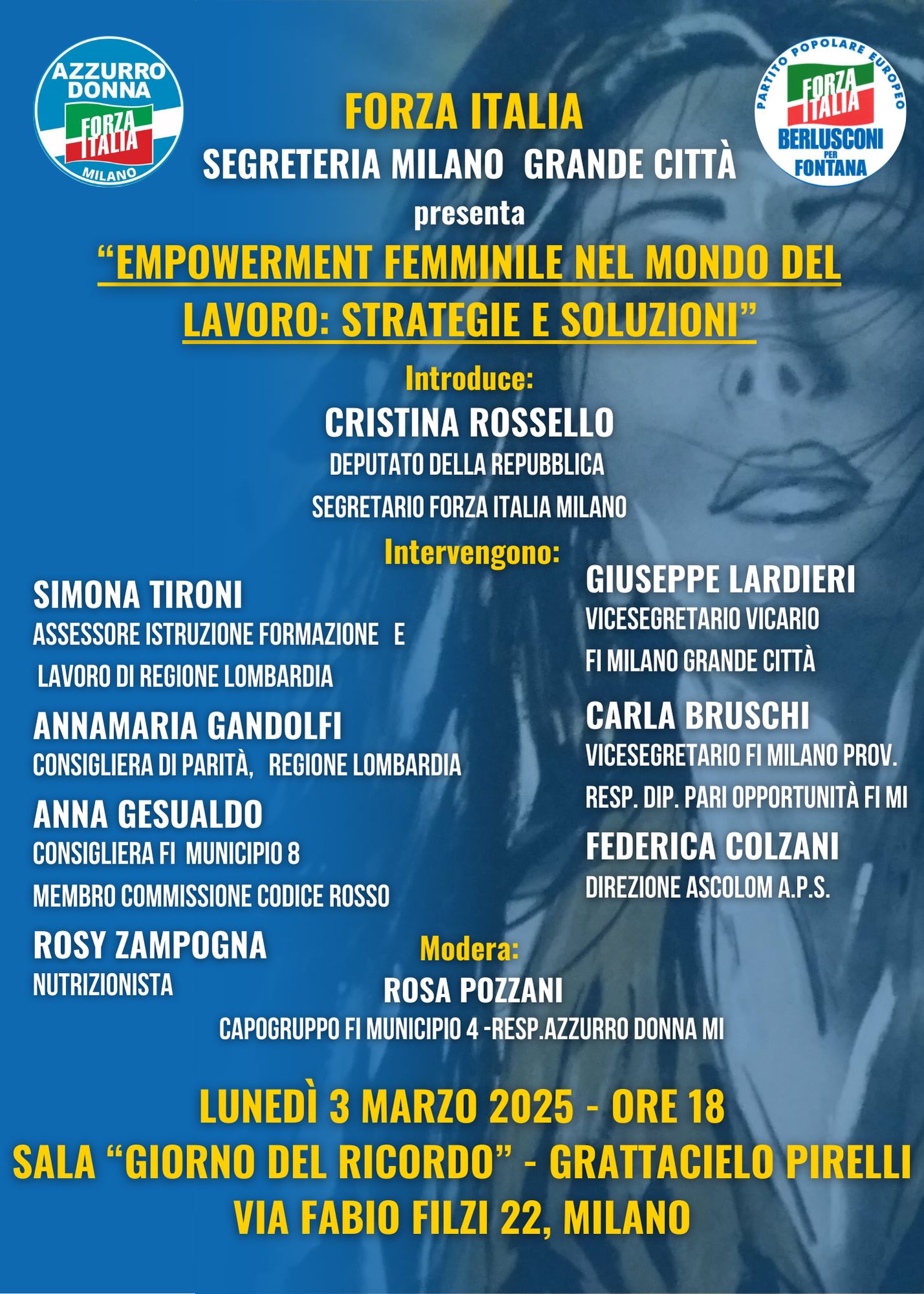 I lavori sono stati aperti dall’On. Cristina Rossello, deputato della Repubblica e Segretario di FI Milano, che è da sempre al fianco delle donne anche grazie al suo Progetto Donne e Futuro, partito nel 2007, come spunto di riflessione sul contributo femminile nel mondo del lavoro, con lo scopo di nobilitare le eccellenze femminili, per favorire il conseguimento delle pari opportunità e promuovere l’immagine delle donne che si sono distinte nei rispettivi ambiti di attività.