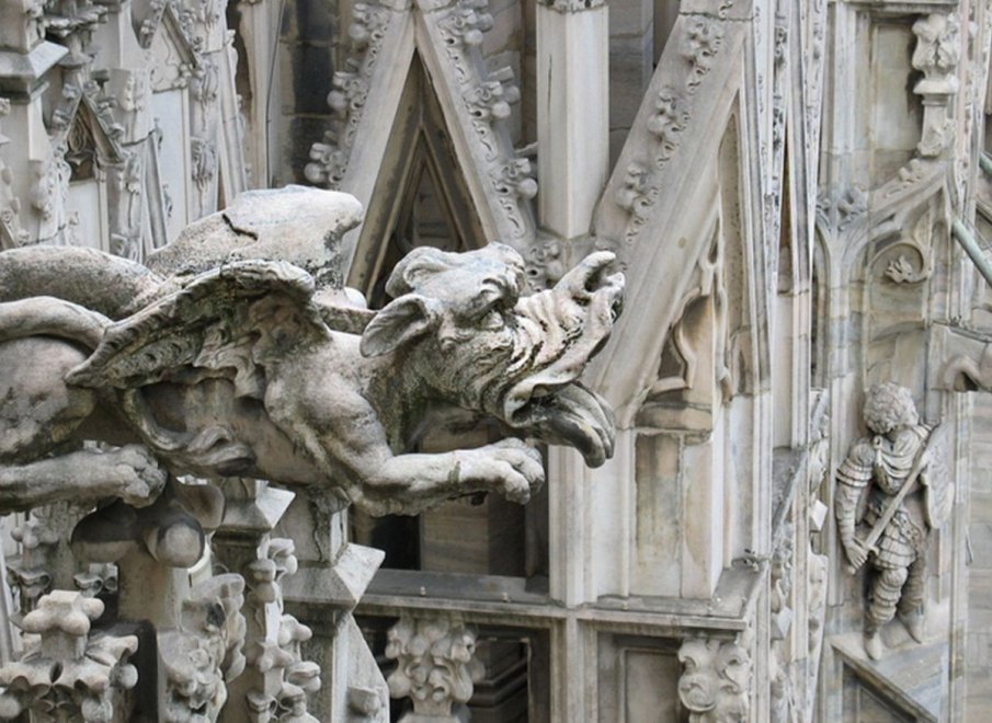 Le statue, intanto, non sono solo religiose e quando piove l’acqua scroscia copiosa dai 96 doccioni chiamati gargoyles.