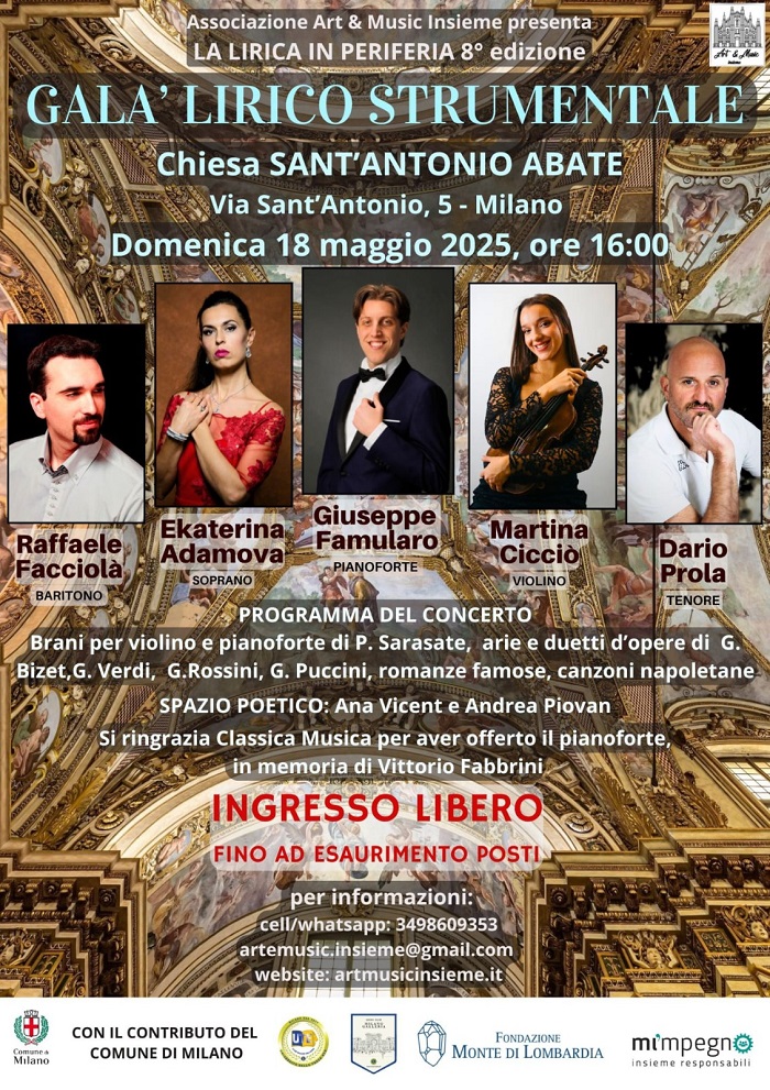 La splendida Chiesa di Sant’Antonio Abate, prezioso esempio di fine Manierismo nel cuore di Milano, tra il Duomo e la sede storica dell’Università Statale, ospiterà nel pomeriggio di domenica 18 maggio il “Gran Galà Lirico Strumentale” della nota Associazione Art & Music Insieme.
