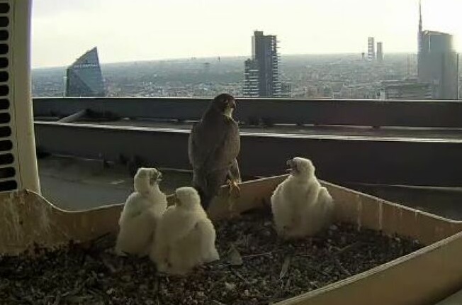Stiamo parlando di una coppia di falchi pellegrini che esattamente da 11 anni consecutivi nidifica sul tetto del grattacielo Pirelli, sede della Regione, in un nido appositamente mantenuto per loro, non il classico nido da volatili, bensì un nido fatto con un’ampio contenitore di legno riempito di uno strato in ciottoli di ghiaietto esattamente come accadrebbe in natura.