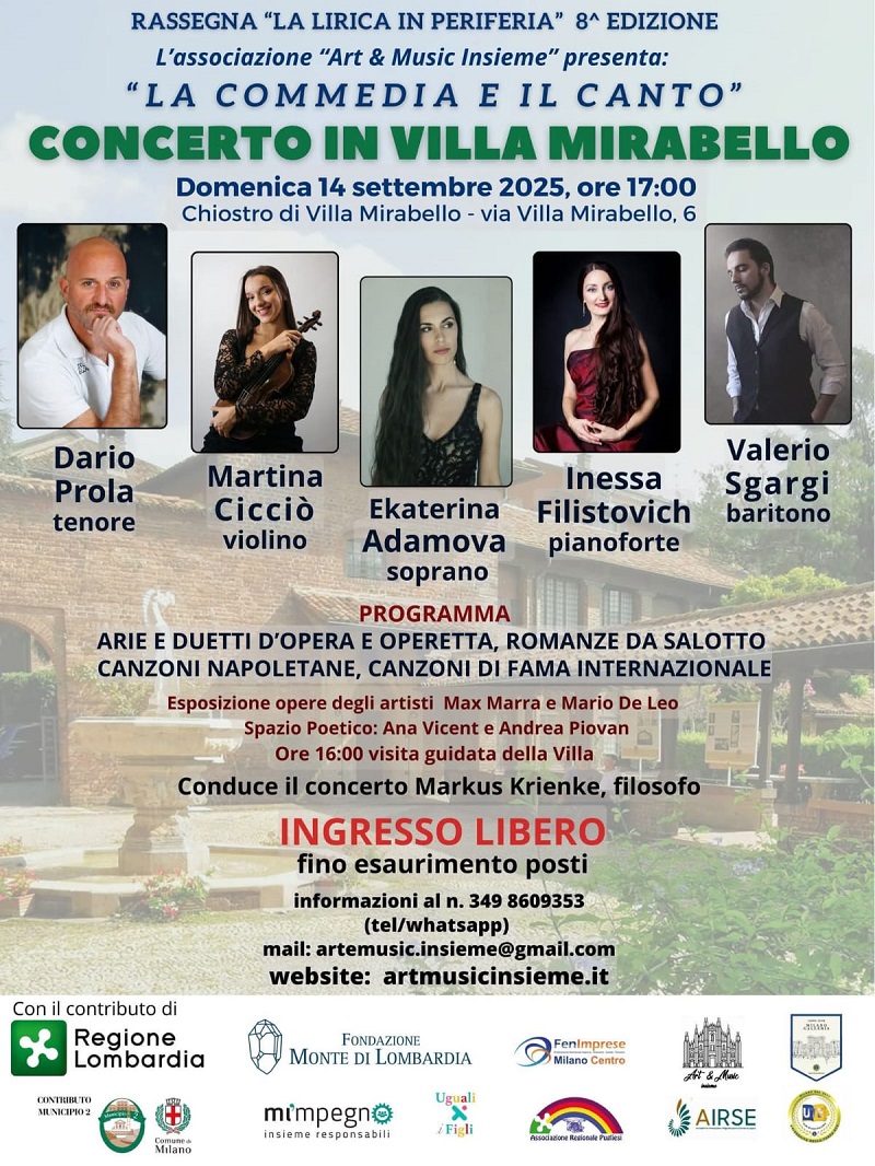 L’ottava edizione della rassegna “La lirica in periferia” si apre domenica 14 settembre alle ore 17 nella storica sede di Villa Mirabello a Milano, di origine viscontea. Il suggestivo chiostro centrale, in stile medievale, elegante e impreziosito dalla fontana quattrocentesca detta del “Mangia Bagaj” ospiterà il concerto dell’Associazione “Art & Music Insieme”in cui si esibiranno il sopranoEkaterina Adamova, Martina Cicciò al violino, Inessa Filistovich alpianoforte, il tenore Dario Prola e il baritono Valerio Sgargi. Il concerto sarà presentato dal filosofo Markus Krienke, molto coinvolgente nella sua spiegazione dei vari pezzi e del filo conduttore dell’evento.