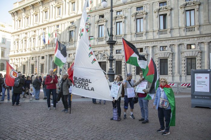 Milano, Presidio propal a sostegno della Palestina , Gaza e Global Sumud Flotilla di fronte palazzo marino in Piazza Scala (chiamata dagli attivisti Piazza Gaza) durante la seduta del Consiglio Comunale al grido “Stop Gemellaggio tra il comune di Milano e Tel Aviv”