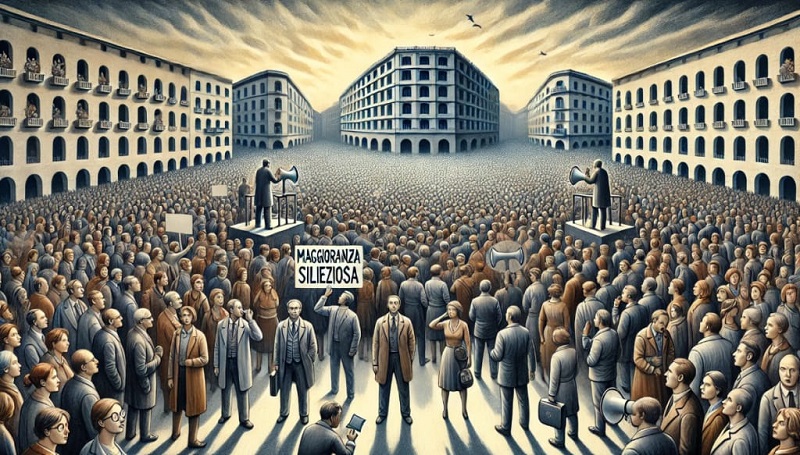 Il Parlamento è simile a un mercato vociante nel quale il Governo con fatica riesce a esporre le proprie proposte. Nulla va bene per l’opposizione ma nulla, però, essa offre in alternativa. La Legge Finanziaria  avanza con fatica e l’ultimo passaggio per l’approvazione definitiva della Riforma della Giustizia è accompagnato dal vocio trasformatosi in urla e dura contestazione dell’opposizione, mentre l’ala della Magistratura contraria alla riforma, affila e mette in campo tutte le sue armi., l’ultima … la bocciatura della Corte dei conti, pare per forma carente di presentazione e qualche link di troppo, dell’inizio dei lavori del Ponte dello Stretto per unire l’Italia alla Sicilia. Io, e penso la maggior parte dei cittadini, siamo costretti ad osservare e a subire tanto scempio istituzionale per cui, non avendo l’abitudine a reagire con la stessa abilità e durezza delle “sinistre”, siamo assuefatti nel subire e non abbiamo  più quel briciolo di energia per mettere in piedi un Corteo della Maggioranza Silenziosa, come fecero nel 1971 a Milano, con l’obbiettivo di evidenziare la protesta del ceto medio contro il riaffiorare del comunismo e delle sinistre extraparlamentari.