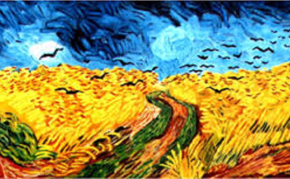 Ma sì, l’imitazione è quasi perfetta: traspare profonda solitudine e un tormento dell’anima in cui riconoscersi e lasciare poi libera la follia in quel volo dei corvi che diventa ossessivo in una delle riproduzioni. Un’affinità con il grande pittore che nessuno deve capire o immaginare, espressa con pochi colori fondamentali: il giallo per rappresentare il grano, i segni verdi e rossi indicano i sentieri che attraversano i campi. Pennellate materiche, essenziali per rendere la forza del pensiero, l’intensità di una sofferenza al di là della realtà.