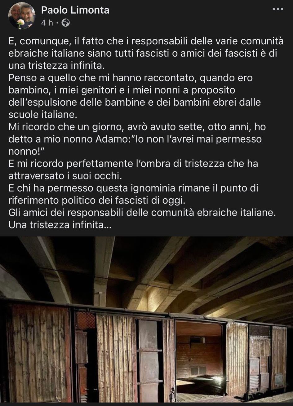 Dopo aver evocato ricordi familiari legati alle leggi razziali del 1938, Limonta conclude accusando le comunità ebraiche di essere oggi “amiche dei fascisti”, ribaltando in modo oltraggioso la storia e la memoria di chi quelle leggi le subì sulla propria pelle. È un cortocircuito morale e politico che ferisce non solo gli ebrei italiani, ma ogni cittadino che crede nella verità storica e nel rispetto.