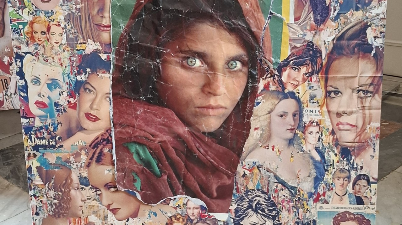 Questa volta il mio sguardo si è fermato su un’opera che non consente vie di fuga. Al centro, il noto volto della giovane donna afghana, allora immortalato da Steve McCurry, dallo sguardo magnetico, incorniciato da un velo rosso. La superficie è tutta screpolata, come un manifesto affisso e strappato mille volte. Ai margini, un brulicare di altre figure femminili (sante, dive del cinema, madri rinascimentali, icone pubblicitarie) si sovrappongono in un collage di carta lacerata e colori saturi.