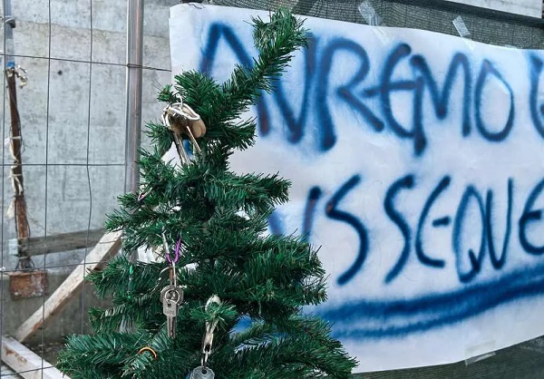 Davanti al cantiere LAC, le famiglie hanno inoltre allestito un simbolico albero di Natale. Al posto delle decorazioni tradizionali, l’albero è stato addobbato con le chiavi di casa, le stesse chiavi che oggi restano “congelate” insieme al loro futuro.