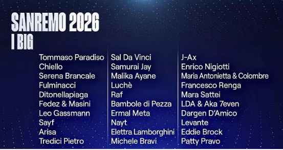 I 30 Big in gara sono: Tommaso Paradiso, Chiello, Serena Brancale, Fulminacci, Ditonellapiaga, Fedez & Masini, Leo Gassmann, Sayf, Arisa, Tredici Pietro, Sal Da Vinci, Samurai Jay Malika Ayane, Luchè, Raf, Bambole di pezza, Ermal Meta, Nayt Elettra Lamborghini, Michele Bravi, J-Ax, Enrico Nigiotti, Maria Antonietta & Colombre, Francesco Renga, Mara Sattei, LDA &Aka 7even, Dargen D’Amico, Levante, Eddie Brock e Patty Pravo. Nel corso della serata del 14 dicembre di “Sarà Sanremo”, in onda su Rai 1 in diretta dal Casinò di Sanremo, Conti svelerà i titoli dei brani dei 30 Big in gara al prossimo Festival. Appuntamento poi al Teatro Ariston, dal 24 al 28 febbraio 2026, in diretta su Rai 1, Radio2 e RaiPlay. “C’è tantissima varietà, un grandissimo fermento musicale, ancora una volta a dimostrazione di come la musica italiana sia in continua evoluzione, tantissimi esordi e qualche conferma e tanti sapori diversa nella musica italiana”, ha detto il conduttore Carlo Conti svelando, con “gioia” al TG1 i nomi in gara dei big al prossimo Festival di